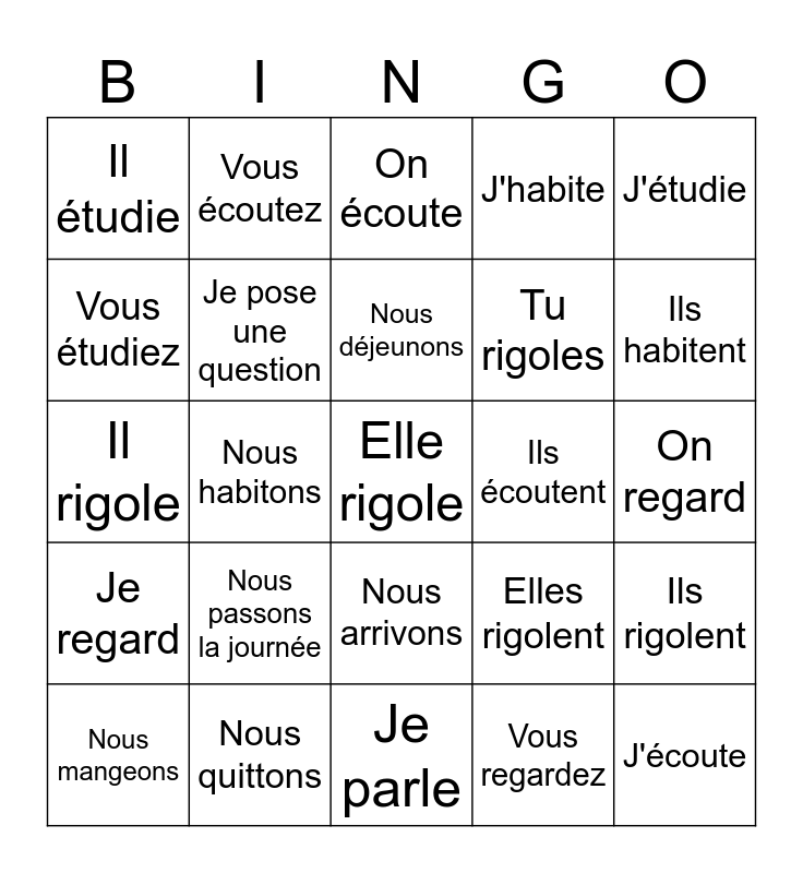 This bingo card has a free space and 24 words: Nous passons la journée, Nous quittons, Nous déjeunons, Nous mangeons, J'étudie, Il étudie, Vous étudiez, Vous écoutez, Ils écoutent, Nous arrivons, Tu rigoles, Il rigole, Elles rigolent, Ils rigolent, Je pose une question, Vous regardez, On regard, On écoute, Ils habitent, Nous habitons, J'écoute, Je regard, J'habite and Je parle.
