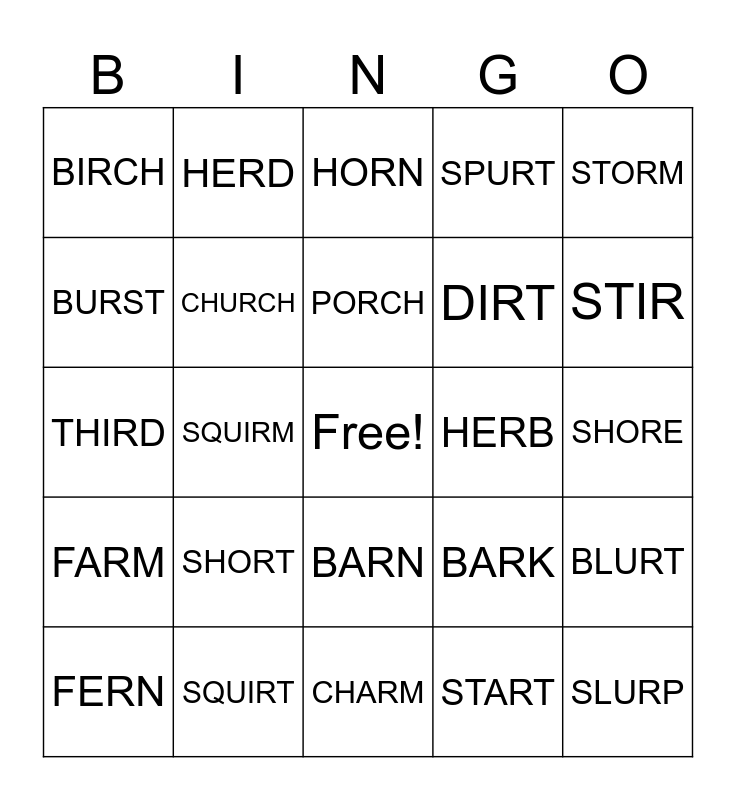 This bingo card has a free space and 29 words: FERN, CHIRP, SQUIRM, THIRST, BIRCH, HORN, CHURCH, SHORT, HERB, SQUIRT, SHORE, SLURP, CHARM, START, STIR, DARK, BARN, FARM, STORM, THIRD, BARK, HARD, DIRT, BURST, SPURT, HERD, BLURT, PORCH and SHIRT.