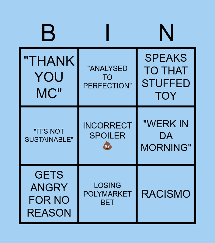 This bingo card has a free space and 8 words: "WERK IN DA MORNING", SPEAKS TO THAT STUFFED TOY, "ANALYSED TO PERFECTION", GETS ANGRY FOR NO REASON, "THANK YOU MC", RACISMO, "IT'S NOT SUSTAINABLE" and LOSING POLYMARKET BET.