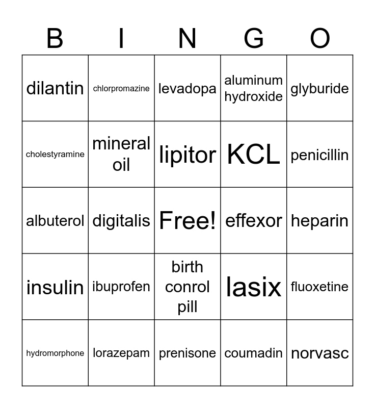 This bingo card has a free space and 29 words: labetalol, lorazepam, levadopa, acetaminophen, glyburide, dilantin, mineral oil, lipitor, effexor, fluoxetine, hydromorphone, digitalis, coumadin, norvasc, albuterol, spironolactone, prenisone, lasix, penicillin, insulin, ibuprofen, naloxone, KCL, heparin, cholestyramine, chlorpromazine, birth conrol pill, aluminum hydroxide and lithium.