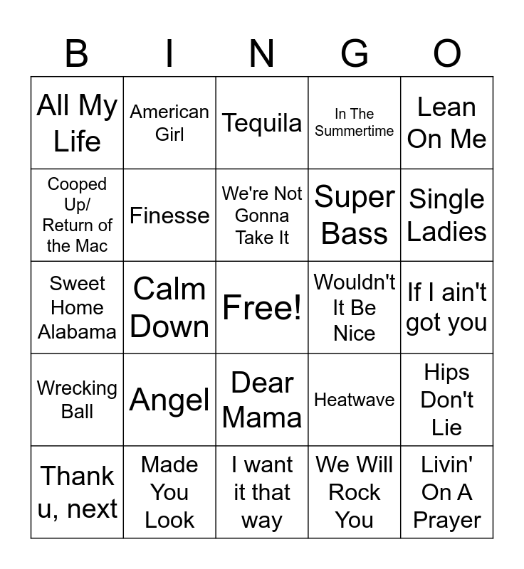 This bingo card has a free space and 24 words: Angel, Made You Look, We're Not Gonna Take It, Thank u, next, Lean On Me, All My Life, Cooped Up/ Return of the Mac, American Girl, Wouldn't It Be Nice, Dear Mama, Super Bass, Sweet Home Alabama, Heatwave, Hips Don't Lie, Finesse, We Will Rock You, If I ain't got you, Tequila, Single Ladies, Calm Down, Livin' On A Prayer, Wrecking Ball, In The Summertime and I want it that way.