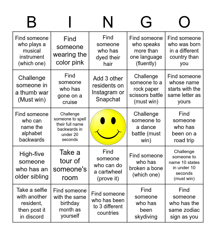 This bingo card has a free space and 24 words: Take a tour of someone's room, Find someone with the same birthday month as yourself, Add 3 other residents on Instagram or Snapchat, Take a selfie with another resident, then post it in discord, Find someone who was born in a different country than you, Find someone who plays a musical instrument (which one), Challenge someone in a thumb war (Must win), Find someone wearing the color pink, Challenge someone to a dance battle (must win), Find someone who can do a cartwheel (prove it), Challenge someone to a rock paper scissors battle (must win), Find someone who can name the alphabet backwards, Find someone who has broken a bone (which one), Challenge someone to name 10 states in under 10 seconds (must win), Find someone who has gone on a cruise, Find someone who has been skydiving, Find someone who has been on a road trip, Find someone who has dyed their hair, Find someone whose name starts with the same letter as yours, Challenge someone to spell their full name backwards in under 20 seconds, Find someone who has the same zodiac sign as you, High-five someone who has an older sibling, Find someone who speaks more than one language (fluently) and Find someone who has been to 3 different countries.