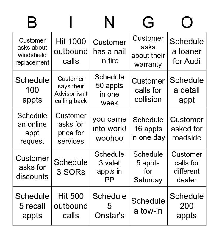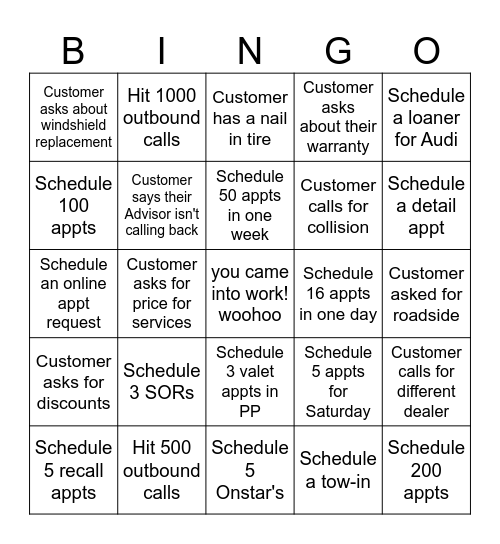 This bingo card has a free space and 24 words: Schedule 3 SORs, Hit 500 outbound calls, Schedule 50 appts in one week, Schedule 5 recall appts, Schedule a loaner for Audi, Customer asks about windshield replacement, Schedule 100 appts, Hit 1000 outbound calls, Schedule 16 appts in one day, Schedule 3 valet appts in PP, Customer calls for collision, Schedule an online appt request, Schedule 5 appts for Saturday, Customer calls for different dealer, Customer says their Advisor isn't calling back, Schedule a tow-in, Customer asked for roadside, Customer has a nail in tire, Schedule a detail appt, Customer asks for price for services, Schedule 200 appts, Customer asks for discounts, Customer asks about their warranty and Schedule 5 Onstar's.