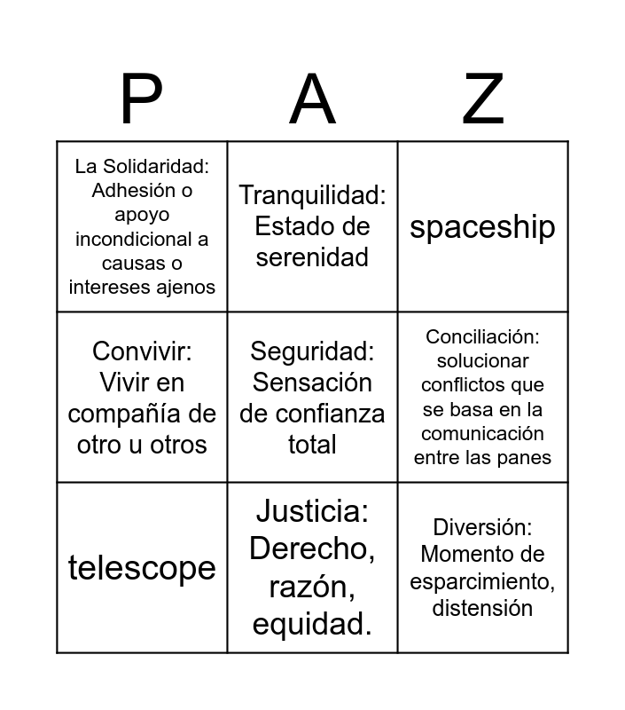 This bingo card has 69 words: space, astronaut, planets, earth, Free!, star, telescope, meteorite, spaceship, La Unión: LA CAPACIDAD DE INTEGRARSE, La Tolerancia: Respeto a las ideas, creencias, Respeto: Acatar lo que se dice y a tender, La Solidaridad: Adhesión o apoyo incondicional a causas o intereses ajenos, Tranquilidad: Estado de serenidad, ConfÍanZa:Esperanza firme que se tiene de alguien o algo., Quietud: Sosiego, reposo, descanso., Sosiego: reposo, descanso., Calma: Paz, tranquilidad., 1 0. AmOr:Sent¡m¡ento de afecto, inclinación y entrega a alguien o algo, Lealtad: Cualidad de leal y legalidad, Territorio Escolar: Lugar para justicia y paz integtral, Verdad . Conformidad de lo que se dice con lo que se siente o se piensa., Justicia: Derecho, razón, equidad., Buen trato: No causar daño, Territorio ComunÍtar¡0:Construir colectivamente la Paz, Armonia:Proporción y correspondencia de unas cosas con otra, Fraternidad: Amistad o afecto entre hermanos, Reparar el daño: Reconocer y resarcir el mal causado, Perdonar: Reconocer falta, ofensa y daño, Territorio ecológico: la ética del cuidado y sentido de pertenencia, Convivir: Vivir en compañía de otro u otros, Derecho a la Vida: Respeto a todo tipo de vida, Proteger el medio ambiente: cuidado de ia casa común, Reconciliamos: Reconocernos y valorarnos, Cumplir lOS acuerdos: Asumiendo compromisos, Desarmar: Nuestra mejor arma defender la vida, Territorio Virtual: Establecer conexiones y crear redes, Ciudadanía: Condición que reconoce a una persona una sene de derechos, Conciliación: solucionar conflictos que se basa en la comunicación entre las panes, 31 .NO Violencia: evitar toda agresión, Diálogo: Comunicar y conversar, Empoderamiento: Adquisición de poder e independencia por parte de un grupo social, Espacio de Paz: Lugar para ser feliz, Med laClÓn: Intervención de una persona u organismo en una discusión o en un enfrentamiento, Promoción: Acción de promocionara una persona, Cooperación: es la suma de fuerza para lograr un objetivo, Inclusión: Involucrar y valorar a todos, SuStentabilidad: es la habilidad de lograr una prosperidad, Resiliencia: capacidad que tiene una persona para superar las adversidades, Seguridad: Sensación de confianza total, Diversión: Momento de esparcimiento, distensión, Serenidad: Tranquilidad y equilibrio, Alegría: Sentimiento de placer, satisfacción y ánimo, Valentía: Estar decidido y firme, Esperanza: Algo se realizará y algo bueno vendrá, Generosidad: desprendimiento y capacidad de compartir, Gratitud: Decir gracias a todos en todo, Decisión: Opción y proyección, Optimismo: Juzgar las cosas en lo más positivo o más favorable., Amabilidad: Actitud de amor a todo y a todos, Compasión: Sentir con que sufre y considerarlo, Ternura: Ser delicado en tratar, Fortaleza: Tener fuerzas ante la pruebas, Razón: Tener juicio y coherencia, Fe: Creer y confiar, Amistad: Relación de afecto, simpatía y confianza, Sabiduría: Actuar con sensatez, prudencia o acierto., Entendimiento: Facultad que permite aprender, entender, and Empatia: Colocarme en los zapatos del otro.