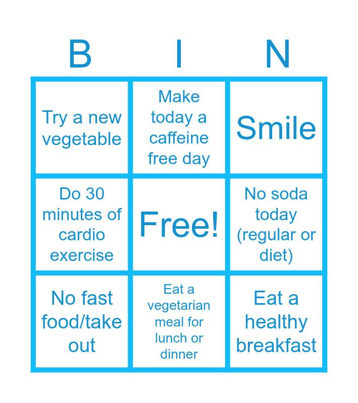 This bingo card has a free space and 24 words: Take a walk around outside for 3 minutes, Drink 16oz of water, Get at least 7 hours of sleep, Eat 1 fruit or vegetable today, Eat a healthy breakfast, Try a new vegetable, Make today a caffeine free day, Smile, Attend an exercise class, Get 10,000 steps today, Go for a walk, Try a new recipe this week, Spend at least 15 minutes walking, Practice 10 minutes of meditation, No fast food/take out, Eat a dark green vegetable, Drink 64+ oz of water, Do 30 minutes of cardio exercise, Eat a vegetarian meal for lunch or dinner, Try a new class or workout, Go for a walk with a family member or friend, Eat 5 fruits and veggies today, No soda today (regular or diet) and Eat a piece of fruit for a snack.