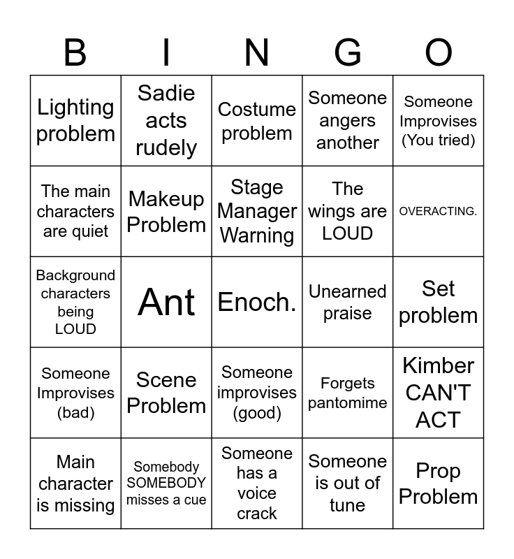This bingo card has a free space and 29 words: Main character is missing, Director has to cover a character, Ant, Unclear stage directions, Lighting problem, Costume problem, Makeup Problem, Scene Problem, Unearned praise, Somebody SOMEBODY misses a cue, Set problem, Prop Problem, Someone has a voice crack, Someone is out of tune, OVERACTING., Over-REACTING, Someone improvises (good), Someone Improvises (bad), Someone Improvises (You tried), Background characters being LOUD, Forgets pantomime, Prop is left offstage, The wings are LOUD, The main characters are quiet, Someone angers another, Sadie acts rudely, Kimber CAN'T ACT, Stage Manager Warning and Main Characters fail their jobs.