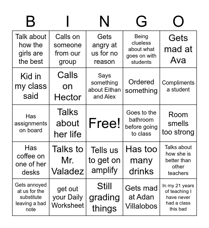 This bingo card has a free space and 24 words: Talks to Mr. Valadez, get out your Daily Worksheet, Says something about Eithan and Alex, Gets annoyed at us for the substitute leaving a bad note, Gets mad at Ava, Talk about how the girls are the best, Kid in my class said, Calls on someone from our group, Goes to the bathroom before going to class, Tells us to get on amplify, Ordered something, Has assignments on board, Has too many drinks, Talks about how she is better than other teachers, Calls on Hector, Gets mad at Adan Villalobos, Room smells too strong, Gets angry at us for no reason, Compliments a student, Talks about her life, In my 21 years of teaching I have never had a class this bad, Has coffee on one of her desks, Being clueless about what goes on with students and Still grading things.