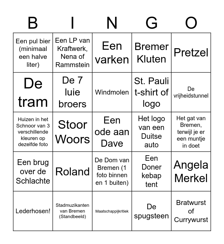 This bingo card has a free space and 24 words: Roland, Stadmuzikanten van Bremen (Standbeeld), Windmolen, Lederhosen!, Pretzel, Een pul bier (minimaal een halve liter), De tram, Een LP van Kraftwerk, Nena of Rammstein, Het logo van een Duitse auto, De Dom van Bremen (1 foto binnen en 1 buiten), St. Pauli t-shirt of logo, Huizen in het Schnoor van 3 verschillende kleuren op dezelfde foto, Een Doner kebap tent, Angela Merkel, De 7 luie broers, De spugsteen, Het gat van Bremen, terwijl je er een muntje in doet, Een varken, De vrijheidstunnel, Stoor Woors, Bratwurst of Currywurst, Een brug over de Schlachte, Bremer Kluten and Maatschappijkritiek.