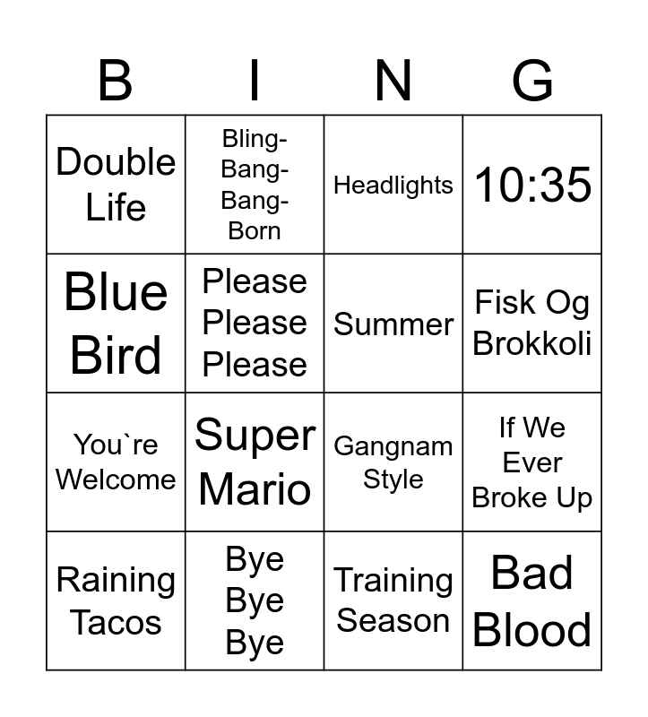 This bingo card has 24 words: Fanga av ein stormvind, Wellerman, Fisk Og Brokkoli, Die With A Smile, Blue Bird, Double Life, Please Please Please, Bling-Bang-Bang-Born, Bye Bye Bye, Baby One More Time, You`re Welcome, Gangnam Style, Pedro, BlimE!, Summer, PLAY, Training Season, Headlights, Super Mario, If We Ever Broke Up, Raining Tacos, Bad Blood, 10:35 and SCOPIN.
