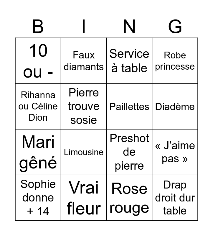 This bingo card has 16 words: Vrai fleur, « J’aime pas », Service à table, 10 ou -, Mari gêné, Faux diamants, Preshot de pierre, Rose rouge, Rihanna ou Céline Dion, Pierre trouve sosie, Sophie donne + 14, Robe princesse, Limousine, Diadème, Paillettes and Drap droit dur table.
