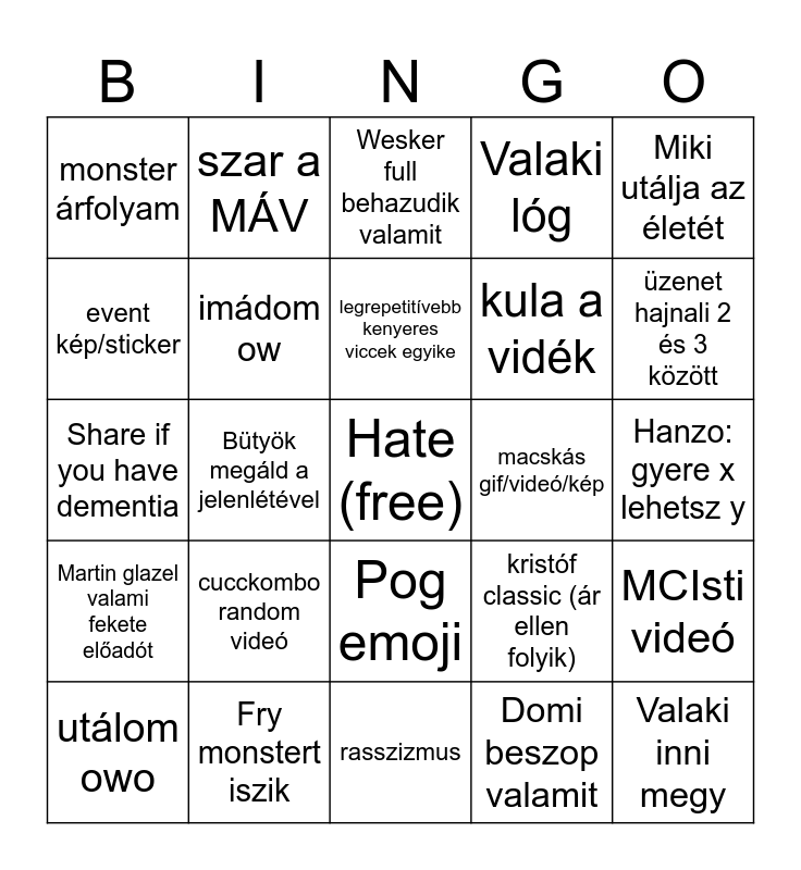 This bingo card has a free space and 24 words: cucckombo random videó, Fry monstert iszik, legrepetitívebb kenyeres viccek egyike, utálom owo, Miki utálja az életét, monster árfolyam, event kép/sticker, szar a MÁV, macskás gif/videó/kép, Pog emoji, kula a vidék, Share if you have dementia, kristóf classic (ár ellen folyik), MCIsti videó, imádom ow, Domi beszop valamit, Hanzo: gyere x lehetsz y, Wesker full behazudik valamit, üzenet hajnali 2 és 3 között, Bütyök megáld a jelenlétével, Valaki inni megy, Martin glazel valami fekete előadót, Valaki lóg and rasszizmus.