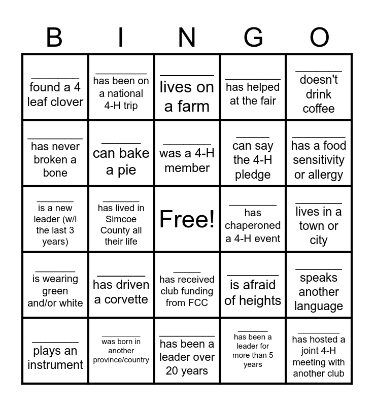 This bingo card has a free space and 24 words: _______ plays an instrument, _______ has driven a corvette, _______ was a 4-H member, _______ has been a leader for more than 5 years, _______ doesn't drink coffee, _______ found a 4 leaf clover, _________ has been on a national 4-H trip, ______ lives on a farm, ________ has chaperoned a 4-H event, _______ lives in a town or city, _______ is a new leader (w/i the last 3 years), _____ can bake a pie, _______ is afraid of heights, _______ speaks another language, _________ has never broken a bone, _________ was born in another province/country, _________ has been a leader over 20 years, _________ has helped at the fair, ________ has a food sensitivity or allergy, _______ is wearing green and/or white, _______ has lived in Simcoe County all their life, _____ has received club funding from FCC, _____ can say the 4-H pledge and ________ has hosted a joint 4-H meeting with another club.