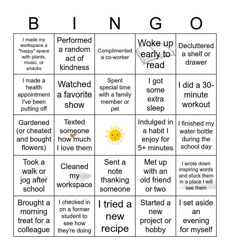 This bingo card has 4 images, a free space and 24 words: Cleaned my workspace, I checked in on a former student to see how they're doing, Spent special time with a family member or pet, Brought a morning treat for a colleague, Decluttered a shelf or drawer, I made my workspace a "happy" space with plants, music, or snacks, I made a health appointment I've been putting off, Performed a random act of kindness, Indulged in a habit I enjoy for 5+ minutes, Sent a note thanking someone, I got some extra sleep, Gardened (or cheated and bought flowers), Met up with an old friend or two, I wrote down inspiring words and stuck them in a place I will see them, Watched a favorite show, Started a new project or hobby, I finished my water bottle during the school day, Complimented a co-worker, I did a 30-minute workout, Texted someone how much I love them, I set aside an evening for myself, Took a walk or jog after school, Woke up early to read and I tried a new recipe.