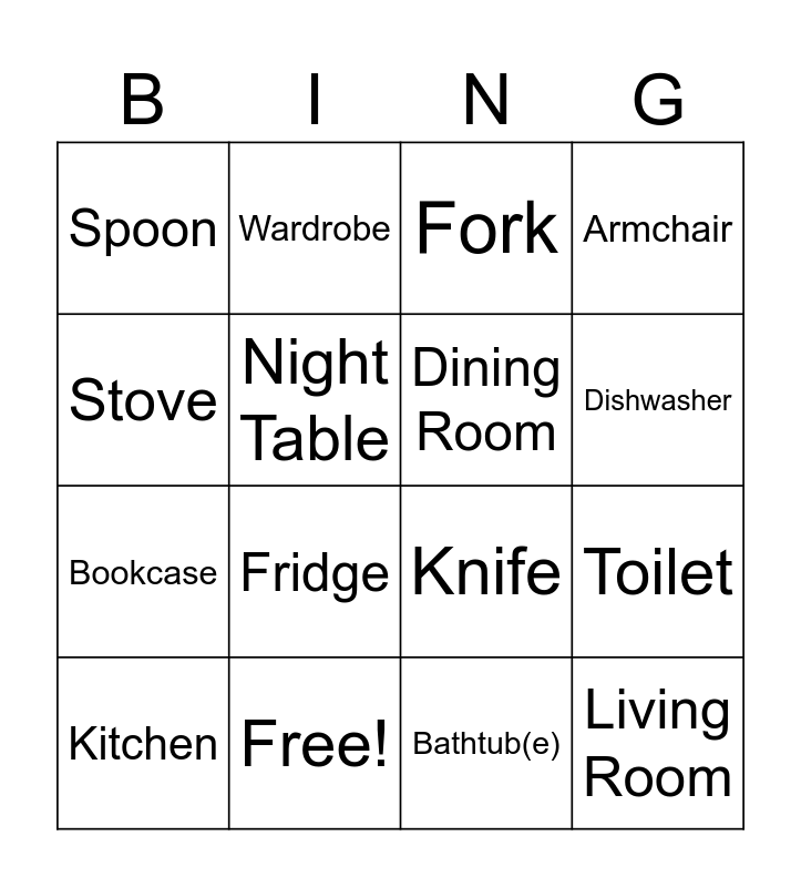 This bingo card has 22 words: Free!, Bedroom, Wardrobe, Bed, Night Table, Dining Room, Spoon, Fork, Knife, Living Room, Bookcase, Armchair, Coffee Table, Bathroom, Bathtub(e), Sink, Toilet, Kitchen, Fridge, Stove, Dishwasher and Furniture.