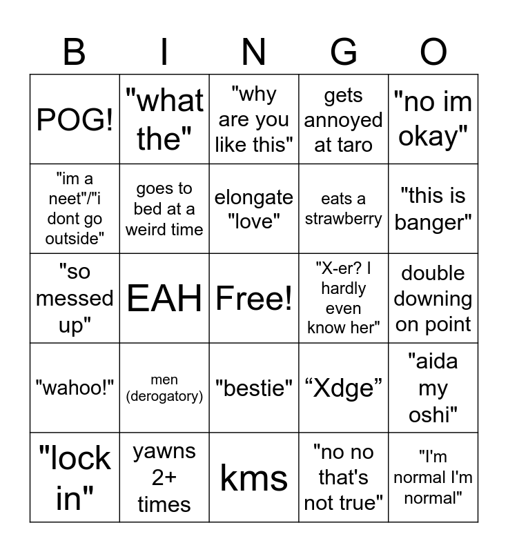 This bingo card has a free space and 24 words: men (derogatory), yawns 2+ times, elongate "love", "lock in", "no im okay", POG!, "im a neet"/"i dont go outside", "what the", "X-er? I hardly even know her", "bestie", eats a strawberry, "so messed up", “Xdge”, "aida my oshi", goes to bed at a weird time, "no no that's not true", double downing on point, "why are you like this", "this is banger", EAH, "I'm normal I'm normal", "wahoo!", gets annoyed at taro and kms.