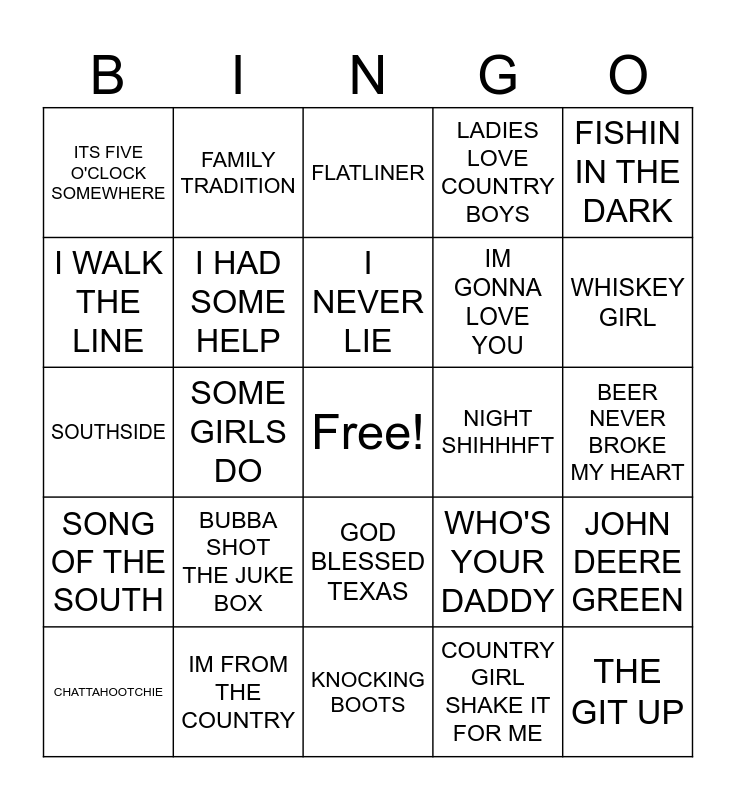This bingo card has a free space and 44 words: BOOT SCOOTIN BOOGIE, THE GIT UP, GOOD TIME, CHATTAHOOTCHIE, OLD TIME ROCK AND ROLL, COUNTRY GIRL SHAKE IT FOR ME, FLATLINER, T-R-O-U-B-L-E, FISHIN IN THE DARK, IM FROM THE COUNTRY, LADIES LOVE COUNTRY BOYS, NIGHT SHIHHHFT, GOD BLESSED TEXAS, BUBBA SHOT THE JUKE BOX, TWO STEP, KNOCKING BOOTS, HICKTOWN, SOUTHSIDE, DEAD MANS HAND, WHISKEY GIRL, FAMILY TRADITION, RING OF FIRE, SHE'S COUNTRY, ITS FIVE O'CLOCK SOMEWHERE, UP DOWN, BEER NEVER BROKE MY HEART, BEER FOR MY HORSES, I LIKE IT I LOVE IT, WHO'S YOUR DADDY, SONG OF THE SOUTH, 1, 2 MANY, JOHN DEERE GREEN, ERY LIL HONKY TONK BAR, HONKYTONK BADONKADONK, SOME GIRLS DO, YOUR MAN, DIXIELAND DELIGHT, ONE MARGARITA, I NEVER LIE, I WALK THE LINE, IM GONNA LOVE YOU, COWGIRLS, I HAD SOME HELP and ACKY BREAKY HEART.