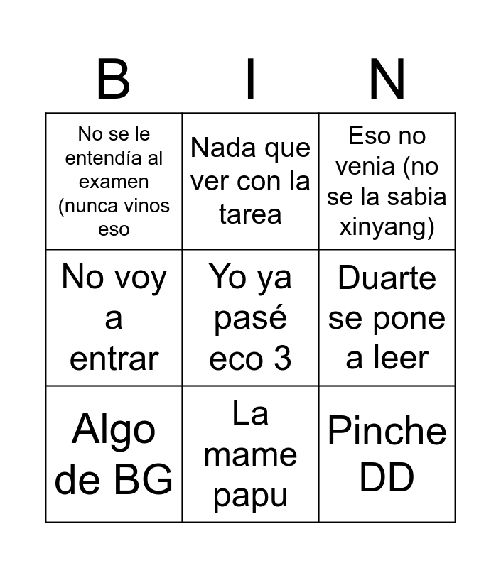 This bingo card has 9 words: Algo de BG, Eso no venia (no se la sabia xinyang), Nada que ver con la tarea, No voy a entrar, No se le entendía al examen (nunca vinos eso, Duarte se pone a leer, Yo ya pasé eco 3, Pinche DD and La mame papu.