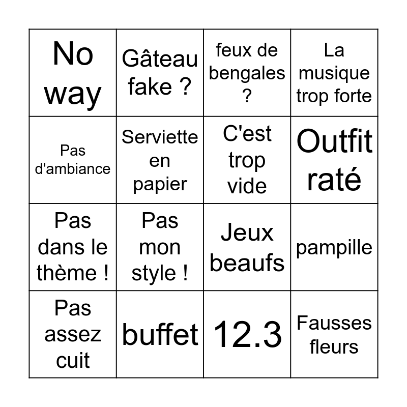 This bingo card has 16 words: buffet, pampille, feux de bengales ?, No way, Pas dans le thème !, Gâteau fake ?, Jeux beaufs, 12.3, Pas d'ambiance, Serviette en papier, Pas assez cuit, La musique trop forte, Pas mon style !, Outfit raté, C'est trop vide and Fausses fleurs.