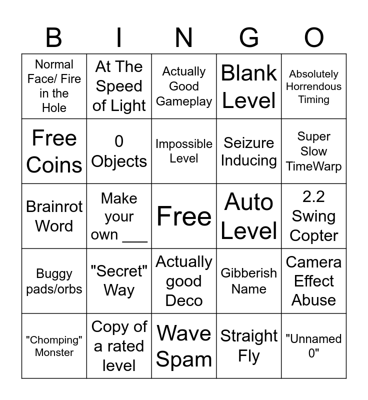 This bingo card has a free space and 24 words: "Secret" Way, Copy of a rated level, Impossible Level, "Chomping" Monster, Absolutely Horrendous Timing, Normal Face/ Fire in the Hole, Free Coins, At The Speed of Light, Auto Level, Actually good Deco, Seizure Inducing, Brainrot Word, Gibberish Name, Camera Effect Abuse, 0 Objects, Straight Fly, 2.2 Swing Copter, Actually Good Gameplay, Super Slow TimeWarp, Make your own ___, "Unnamed 0", Buggy pads/orbs, Blank Level and Wave Spam.