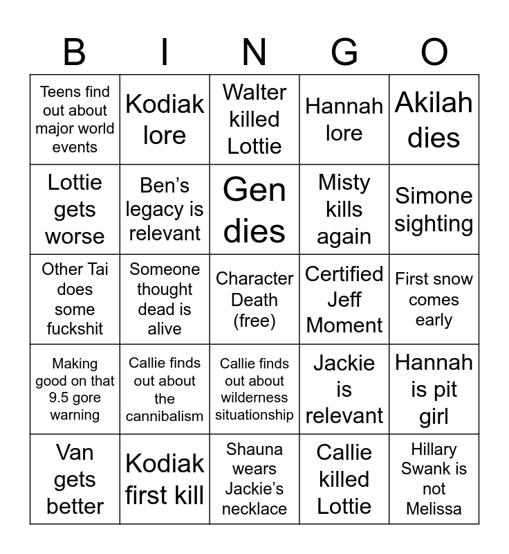 This bingo card has a free space and 44 words: Hillary Swank is Melissa, Hillary Swank is not Melissa, Van dies, Van gets better, Shauna killed Lottie, Callie killed Lottie, Walter killed Lottie, Kodiak knows what the symbol means, Akilah dies, Kodiak first kill, Hannah lore, Certified Jeff Moment, Callie finds out about wilderness situationship, Callie finds out about the cannibalism, Honest to G-d cannibalism in the adult TL, Shauna wears Jackie’s necklace, Yellowjackets find out the search was called off, Other Tai does some fuckshit, Our Tai speaks, Simone sighting, Kodiak lore, Cabin guy lore, Melissa and Shauna break up, Teens find out about major world events, Teens get a message home, First snow comes early, The hunt, Time skip teen TL, Jackie is relevant, Making good on that 9.5 gore warning, Adult Melissa wears a hat, Hannah is pit girl, Mari dies, Britt speaks, Someone thought dead is alive, Someone thought alive is dead, Another Akilah vision, Metal/Gas poisoning confirmed, Gen dies, Lottie gets worse, Misty kills again, Natalie is the real leader, Ben’s legacy is relevant and Hannah dies.