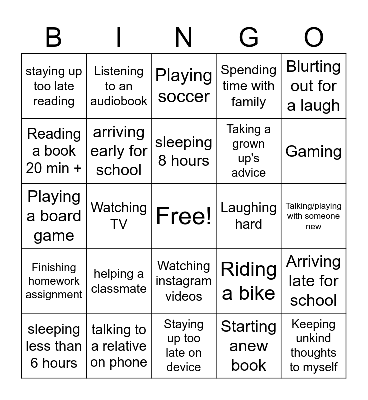 This bingo card has a free space and 24 words: helping a classmate, talking to a relative on phone, sleeping 8 hours, sleeping less than 6 hours, Blurting out for a laugh, staying up too late reading, Reading a book 20 min +, Listening to an audiobook, Laughing hard, Watching instagram videos, Taking a grown up's advice, Playing a board game, Riding a bike, Arriving late for school, arriving early for school, Starting anew book, Talking/playing with someone new, Playing soccer, Gaming, Watching TV, Keeping unkind thoughts to myself, Finishing homework assignment, Spending time with family and Staying up too late on device.
