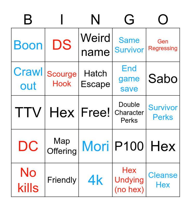 This bingo card has a free space and 34 words: Hex, Hex Undying (no hex), 4k, Close Hatch, DC, Scourge Hook, Gen Regressing, No kills, DS, Killer perks, Hatch Escape, Weird name, Flashlight Save, Protection hit, Double Character Perks, Sabo, Friendly, TTV, Map Offering, P100, Mori, Chase for 1 gen, Boon, Survivor Perks, 4k, Cleanse Hex, Same Survivor, Jump scared, End game save, Crawl out, Hex, Hex, Hex and Hex.