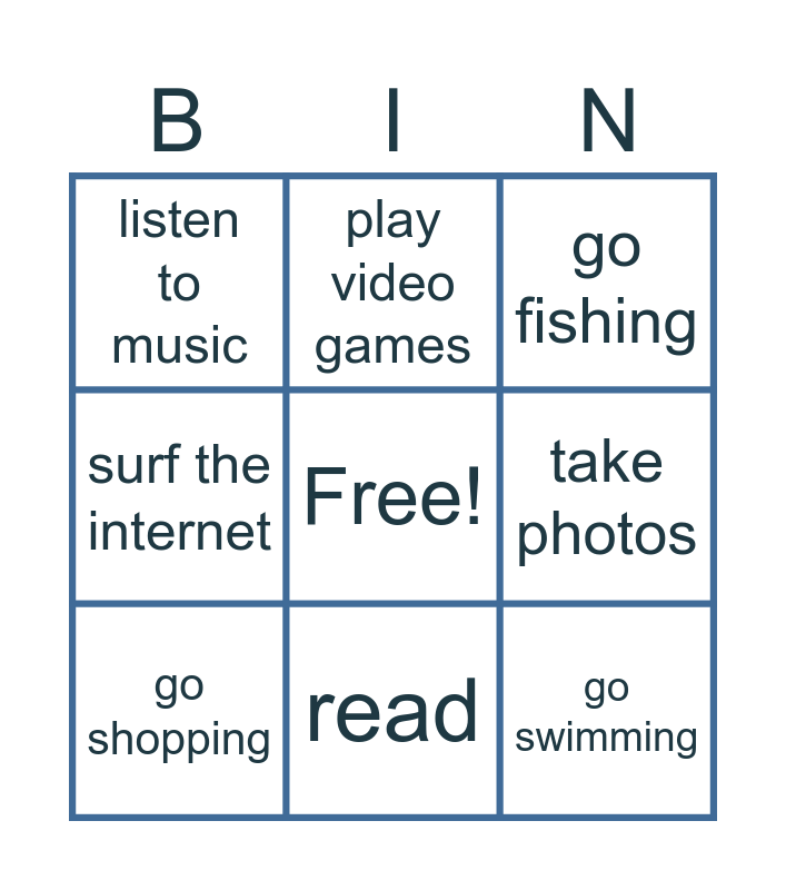 This bingo card has a free space and 15 words: watch TV, go to the cinema, go fishing, listen to music, read, go swimming, paint, do homework, take photos, play an instrument, go cycling, surf the internet, go shopping, play video games and ride a horse.