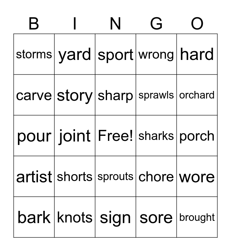 This bingo card has a free space and 24 words: bark, shorts, sharp, sore, hard, storms, yard, sport, sharks, porch, pour, story, chore, wore, carve, knots, sign, wrong, orchard, artist, joint, sprouts, sprawls and brought.