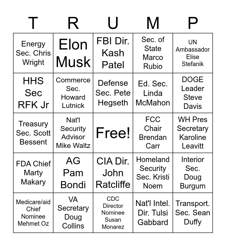 This bingo card has a free space and 24 words: AG Pam Bondi, VA Secretary Doug Collins, Defense Sec. Pete Hegseth, Medicare/aid Chief Nominee Mehmet Oz, UN Ambassador Elise Stefanik, Energy Sec. Chris Wright, HHS Sec RFK Jr, Elon Musk, FCC Chair Brendan Carr, CIA Dir. John Ratcliffe, Ed. Sec. Linda McMahon, Treasury Sec. Scott Bessent, Homeland Security Sec. Kristi Noem, Interior Sec. Doug Burgum, Commerce Sec. Howard Lutnick, Nat'l Intel. Dir. Tulsi Gabbard, WH Pres Secretary Karoline Leavitt, FBI Dir. Kash Patel, DOGE Leader Steve Davis, Nat'l Security Advisor Mike Waltz, Transport. Sec. Sean Duffy, FDA Chief Marty Makary, Sec. of State Marco Rubio and CDC Director Nominee Susan Monarez.