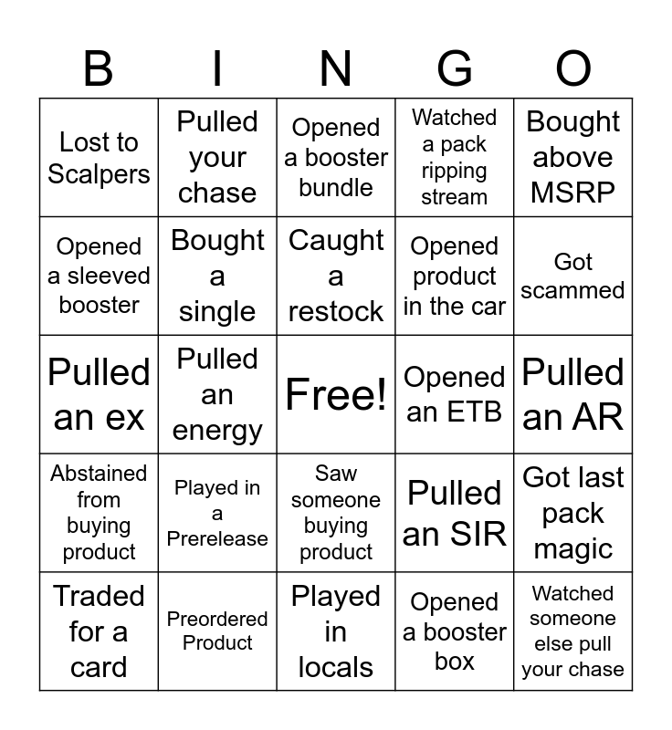 This bingo card has a free space and 24 words: Played in a Prerelease, Preordered Product, Caught a restock, Traded for a card, Bought above MSRP, Lost to Scalpers, Opened a sleeved booster, Pulled your chase, Opened an ETB, Saw someone buying product, Opened product in the car, Pulled an ex, Pulled an SIR, Got last pack magic, Bought a single, Opened a booster box, Pulled an AR, Opened a booster bundle, Got scammed, Pulled an energy, Watched someone else pull your chase, Abstained from buying product, Watched a pack ripping stream and Played in locals.