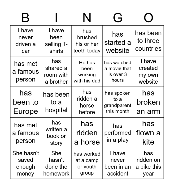 This bingo card has 27 words: She hasn't saved enough money, She hasn't done the homework, He has been working with his dad, I have never been in an accident, I have created my own website, I have never driven a car, I have been selling T-shirts, has ridden a horse, has watched a movie that is over 3 hours, has ridden on a bike this year, has been to Europe, has shared a room with a brother, has worked at a camp or youth group, has performed in a play, has broken an arm, has a pet, has been to a hospital, has brushed his or her teeth today, has spoken to a grandparent this month, has been to three countries, has met a famous person, has written a book or story, has ridden a horse before, has started a website, has flown a kite, has met a famous person and has broken an arm.