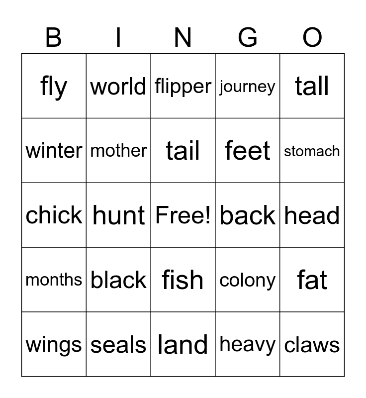 This bingo card has a free space and 24 words: wings, black, tail, heavy, tall, fly, world, flipper, back, head, chick, mother, colony, fat, winter, seals, land, journey, stomach, months, hunt, fish, feet and claws.