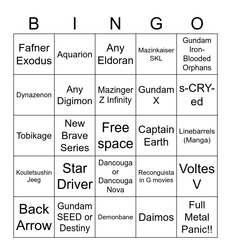 This bingo card has a free space and 24 words: Star Driver, Gundam SEED or Destiny, Mazinger Z Infinity, Back Arrow, Gundam Iron-Blooded Orphans, Fafner Exodus, Dynazenon, Aquarion, Captain Earth, Dancouga or Dancouga Nova, Gundam X, Tobikage, Reconguista in G movies, Voltes V, Any Digimon, Daimos, Linebarrels (Manga), Any Eldoran, s-CRY-ed, New Brave Series, Full Metal Panic!!, Koutetsushin Jeeg, Mazinkaiser SKL and Demonbane.