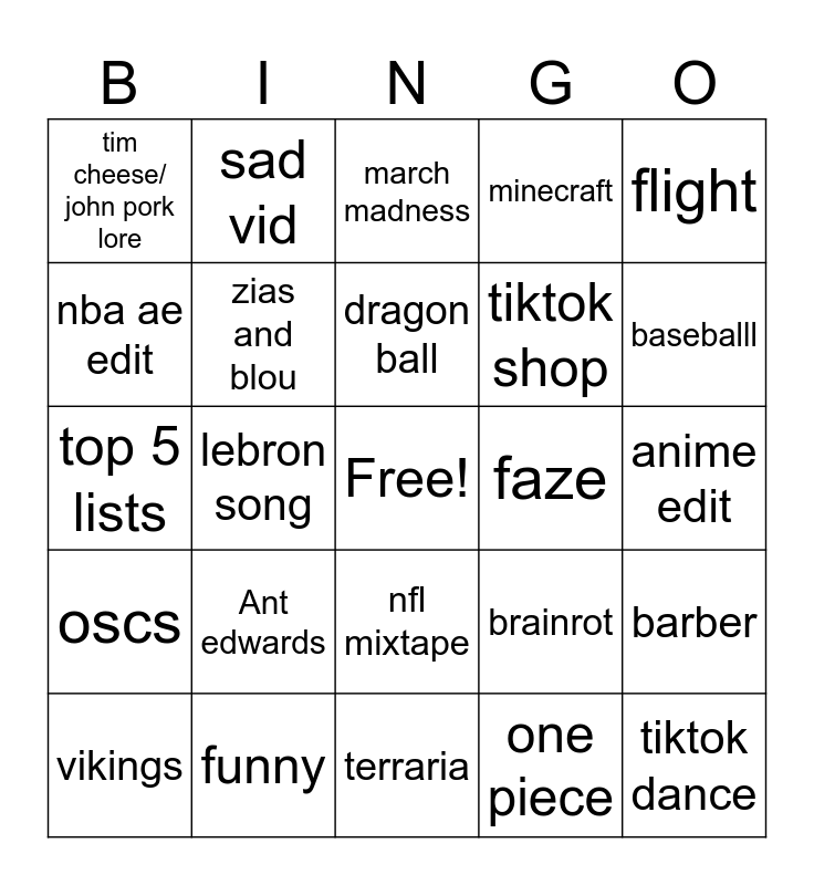 This bingo card has a free space and 24 words: Ant edwards, funny, dragon ball, vikings, flight, tim cheese/ john pork lore, nba ae edit, sad vid, faze, nfl mixtape, tiktok shop, top 5 lists, brainrot, barber, zias and blou, one piece, anime edit, march madness, baseballl, lebron song, tiktok dance, oscs, minecraft and terraria.