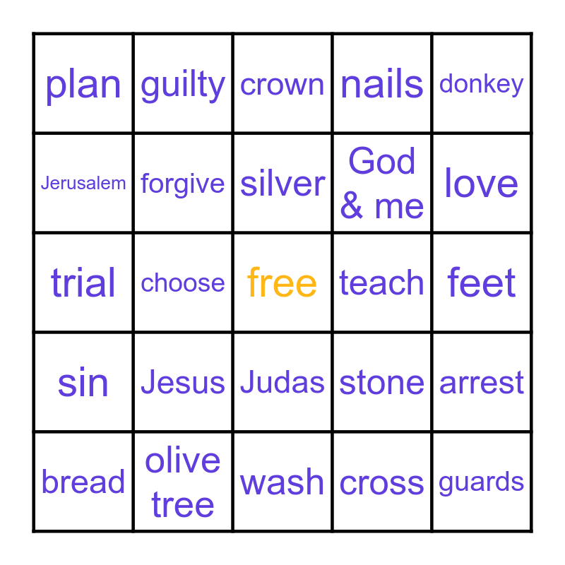 This bingo card has a free space and 34 words: palms, cross, dinner, prays, sin, forgive, donkey, bread, guilty, son of God, silver, crown, tomb, he lives!, teach, love, olive tree, trial, Jesus, stone, Judas, rescue, plan, feet, wash, guards, nails, soldier, God & me, Jerusalem, good right way, choose, arrest and darkness.