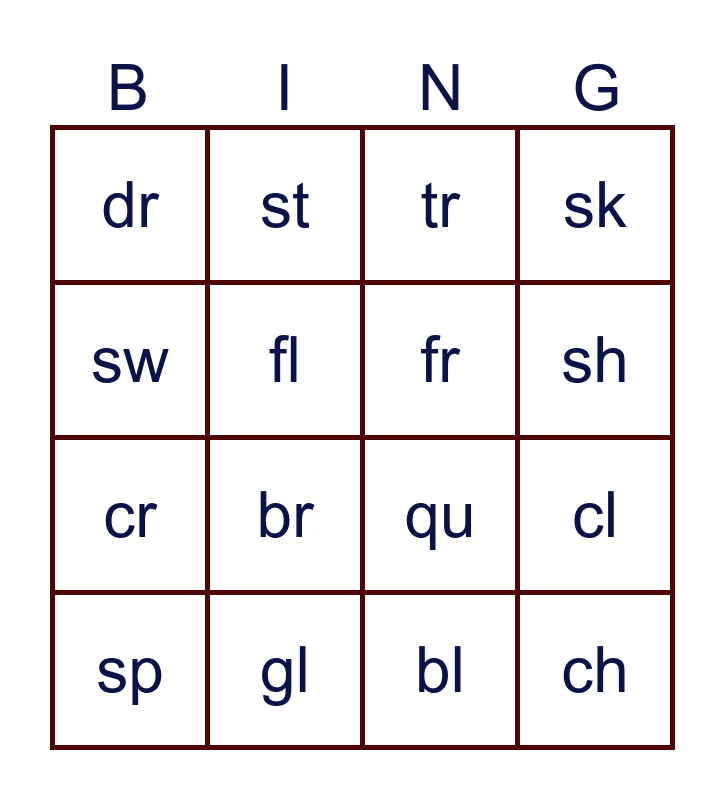 This bingo card has 19 words: qu, pl, tr, ch, cl, sw, bl, dr, st, cr, br, fl, fr, gl, sp, gr, sk, sh and sl.
