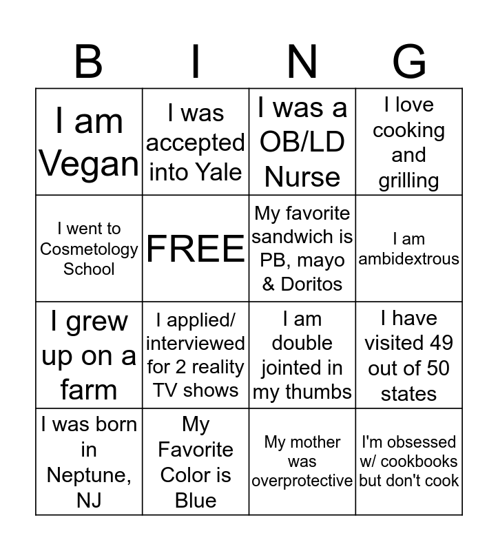 This bingo card has 16 words: My Favorite Color is Blue, I have visited 49 out of 50 states, I was a OB/LD Nurse, I am Vegan, I grew up on a farm, I was accepted into Yale, I am double jointed in my thumbs, My mother was overprotective, I went to Cosmetology School, FREE, I was born in Neptune, NJ, I love cooking and grilling, I applied/ interviewed for 2 reality TV shows, I am ambidextrous, My favorite sandwich is PB, mayo & Doritos and I'm obsessed w/ cookbooks but don't cook.