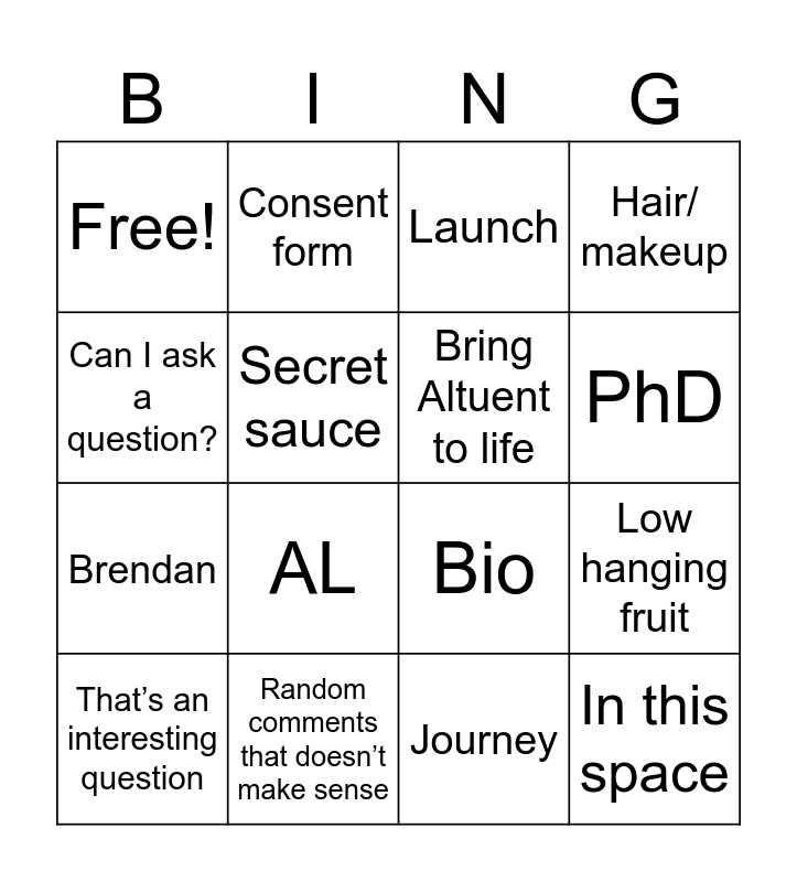 This bingo card has 16 words: That’s an interesting question, Random comments that doesn’t make sense, Launch, Hair/ makeup, Can I ask a question?, Consent form, Bio, Low hanging fruit, Free!, Secret sauce, Journey, PhD, Brendan, AL, Bring Altuent to life and In this space.