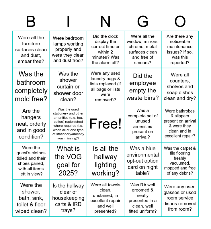 This bingo card has a free space and 24 words: What is the VOG goal for 2025?, Is the hallway clear of housekeeping carts & IRD trays?, Were any used laundry bags & lists replaced (if all bags or lists were removed)?, Were the shower, bath, sink, toilet & floor wiped clean?, Are there any noticeable maintenance issues? If so, was this reported?, Were all the furniture surfaces clean and dust, smear free?, Was the bathroom completely mold free?, Were bedroom lamps working properly and were they clean and dust free?, Was a complete set of unused amenities present on arrival?, Is all the hallway lighting working?, Did the employee empty the waste bins?, Are the hangers neat, orderly and in good condition?, Was a blue environmental opt-out option card on night table?, Was the carpet & tile flooring freshly vacuumed, mopped and free of any debris?, Was the shower curtain or shower door clean?, Was RA well groomed & neatly presented in a clean, well fitted uniform?, Were bathrobes & slippers present on arrival & were they clean and in excellent repair?, Did the clock display the correct time or within 2 minutes? Was the alarm off?, Were all counters, shelves and soap dishes clean and dry?, Was the used stationery and other amenities (e.g. tea, coffee) replenished where required (i.e. when all of one type of stationery/amenity was missing)?, Were any used glasses or used room service dishes removed from room?, Were the guest's clothes tidied and their shoes paired, with all items left in view?, Were all the window, mirrors, chrome, metal surfaces clean and free of smears? and Were all towels clean, unstained, in excellent repair and well presented?.