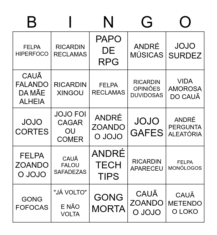 This bingo card has 25 words: CAUÃ FALOU SAFADEZAS, GONG MORTA, FELPA RECLAMAS, GONG FOFOCAS, JOJO SURDEZ, FELPA HIPERFOCO, CAUÃ FALANDO DA MÃE ALHEIA, RICARDIN RECLAMAS, JOJO GAFES, ANDRÉ TECH TIPS, RICARDIN OPINIÕES DUVIDOSAS, JOJO CORTES, RICARDIN APARECEU, FELPA MONÓLOGOS, RICARDIN XINGOU, CAUÃ METENDO O LOKO, ANDRÉ PERGUNTA ALEATÓRIA, PAPO DE RPG, VIDA AMOROSA DO CAUÃ, JOJO FOI CAGAR OU COMER, ANDRÉ ZOANDO O JOJO, "JÁ VOLTO" E NÃO VOLTA, FELPA ZOANDO O JOJO, ANDRÉ MÚSICAS and CAUÃ ZOANDO O JOJO.