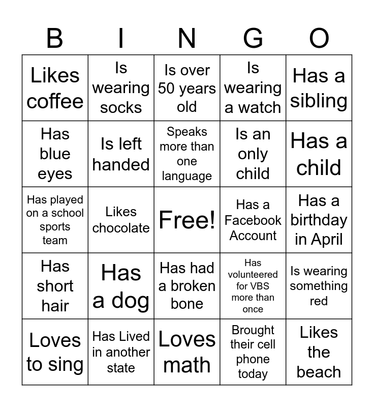 This bingo card has a free space and 24 words: Has a dog, Has Lived in another state, Speaks more than one language, Loves to sing, Has a sibling, Likes coffee, Has blue eyes, Is wearing socks, Has a Facebook Account, Has had a broken bone, Is an only child, Has played on a school sports team, Has volunteered for VBS more than once, Is wearing something red, Is left handed, Brought their cell phone today, Has a birthday in April, Is over 50 years old, Has a child, Likes chocolate, Likes the beach, Has short hair, Is wearing a watch and Loves math.