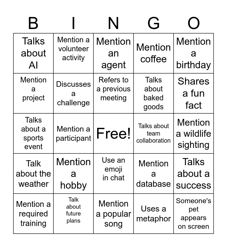 This bingo card has a free space and 24 words: Mention a hobby, Talk about future plans, Refers to a previous meeting, Mention a required training, Mention a birthday, Talks about AI, Mention a project, Mention a volunteer activity, Talks about team collaboration, Use an emoji in chat, Talks about baked goods, Talks about a sports event, Mention a database, Talks about a success, Discusses a challenge, Uses a metaphor, Mention a wildlife sighting, Mention an agent, Shares a fun fact, Mention a participant, Someone's pet appears on screen, Talk about the weather, Mention coffee and Mention a popular song.