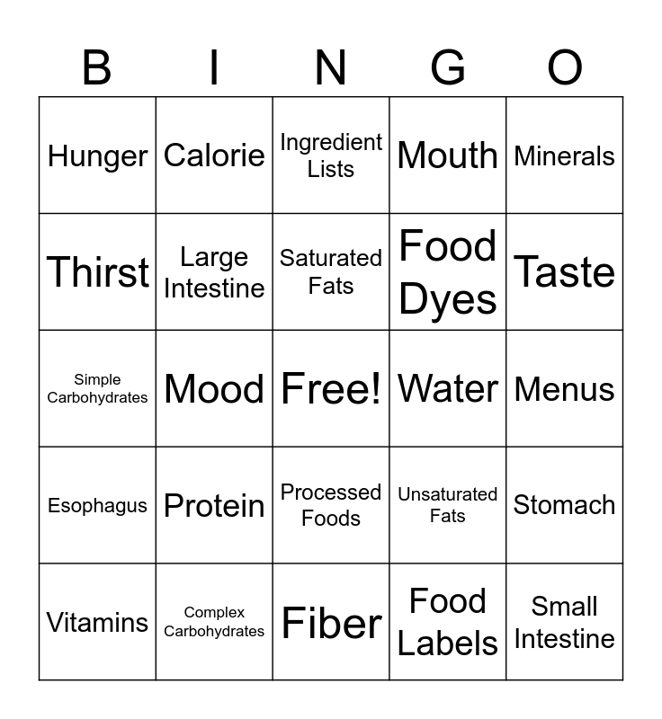 This bingo card has a free space and 24 words: Protein, Complex Carbohydrates, Saturated Fats, Vitamins, Minerals, Hunger, Thirst, Calorie, Water, Processed Foods, Food Dyes, Simple Carbohydrates, Unsaturated Fats, Stomach, Large Intestine, Food Labels, Menus, Ingredient Lists, Taste, Mood, Small Intestine, Esophagus, Mouth and Fiber.