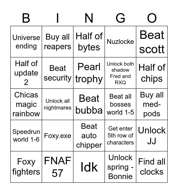 This bingo card has a free space and 24 words: Foxy.exe, FNAF 57, Pearl trophy, Foxy fighters, Beat scott, Universe ending, Half of update 2, Buy all reapers, Beat all bosses world 1-5, Beat auto chipper, Unlock both shadow Fred and RXQ, Chicas magic rainbow, Get enter 5th row of characters, Unlock JJ, Beat security, Unlock spring -Bonnie, Buy all med-pods, Half of bytes, Half of chips, Unlock all nightmares, Find all clocks, Speedrun world 1-6, Nuzlocke and Idk.