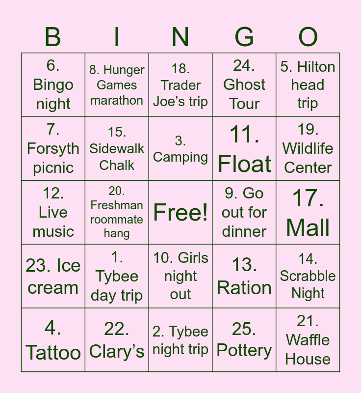 This bingo card has a free space and 25 words: 1. Tybee day trip, 2. Tybee night trip, 3. Camping, 4. Tattoo, 5. Hilton head trip, 6. Bingo night, 7. Forsyth picnic, 8. Hunger Games marathon, 9. Go out for dinner, 10. Girls night out, 11. Float, 12. Live music, 13. Ration, 14. Scrabble Night, 15. Sidewalk Chalk, 16. Host a dinner party, 17. Mall, 18. Trader Joe’s trip, 19. Wildlife Center, 20. Freshman roommate hang, 21. Waffle House, 22. Clary’s, 23. Ice cream, 24. Ghost Tour and 25. Pottery.