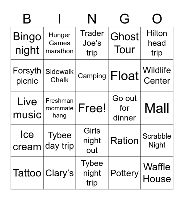 This bingo card has a free space and 25 words: Tybee day trip, Tybee night trip, Camping, Tattoo, Hilton head trip, Bingo night, Forsyth picnic, Hunger Games marathon, Go out for dinner, Girls night out, Float, Live music, Ration, Scrabble Night, Sidewalk Chalk, Host a dinner party, Mall, Trader Joe’s trip, Wildlife Center, Freshman roommate hang, Waffle House, Clary’s, Ice cream, Ghost Tour and Pottery.