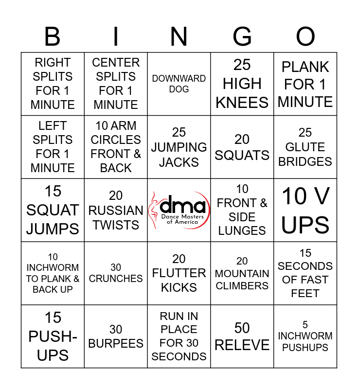 This bingo card has a free space and 24 words: 30 CRUNCHES, 30 BURPEES, 25 JUMPING JACKS, 15 PUSH-UPS, PLANK FOR 1 MINUTE, RIGHT SPLITS FOR 1 MINUTE, LEFT SPLITS FOR 1 MINUTE, CENTER SPLITS FOR 1 MINUTE, 10 FRONT & SIDE LUNGES, 20 FLUTTER KICKS, 20 SQUATS, 15 SQUAT JUMPS, 20 MOUNTAIN CLIMBERS, 15 SECONDS OF FAST FEET, 10 ARM CIRCLES FRONT & BACK, 50 RELEVE, 10 V UPS, DOWNWARD DOG, 25 GLUTE BRIDGES, 20 RUSSIAN TWISTS, 5 INCHWORM PUSHUPS, 10 INCHWORM TO PLANK & BACK UP, 25 HIGH KNEES and RUN IN PLACE FOR 30 SECONDS.