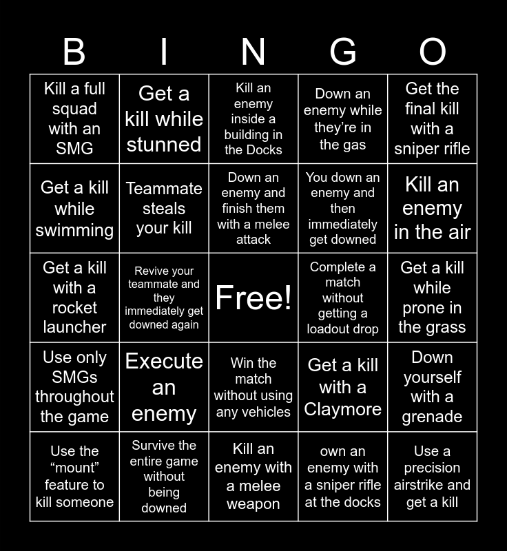 This bingo card has a free space and 29 words: Use the “mount” feature to kill someone, Get a kill in the Prison Block, Revive your teammate and they immediately get downed again, Get the final kill in the final circle, Kill a full squad with an SMG, Kill an enemy inside a building in the Docks, Teammate steals your kill, Execute an enemy, Complete a match without getting a loadout drop, Survive the entire game without being downed, Get a kill while prone in the grass, Use a precision airstrike and get a kill, Kill an enemy with a melee weapon, own an enemy with a sniper rifle at the docks, Kill an enemy in the air, Take out an enemy who’s reviving a teammate, Win the match without using any vehicles, Use only SMGs throughout the game, Get the final kill with a sniper rifle, Get a kill with a rocket launcher, Get a kill with a Claymore, Get a kill while crouch-walking, You down an enemy and then immediately get downed, Get a kill while swimming, Down an enemy while they’re in the gas, Get a kill while stunned, Down yourself with a grenade, Down an enemy and finish them with a melee attack and Get a kill while you’re being shot at from behind.