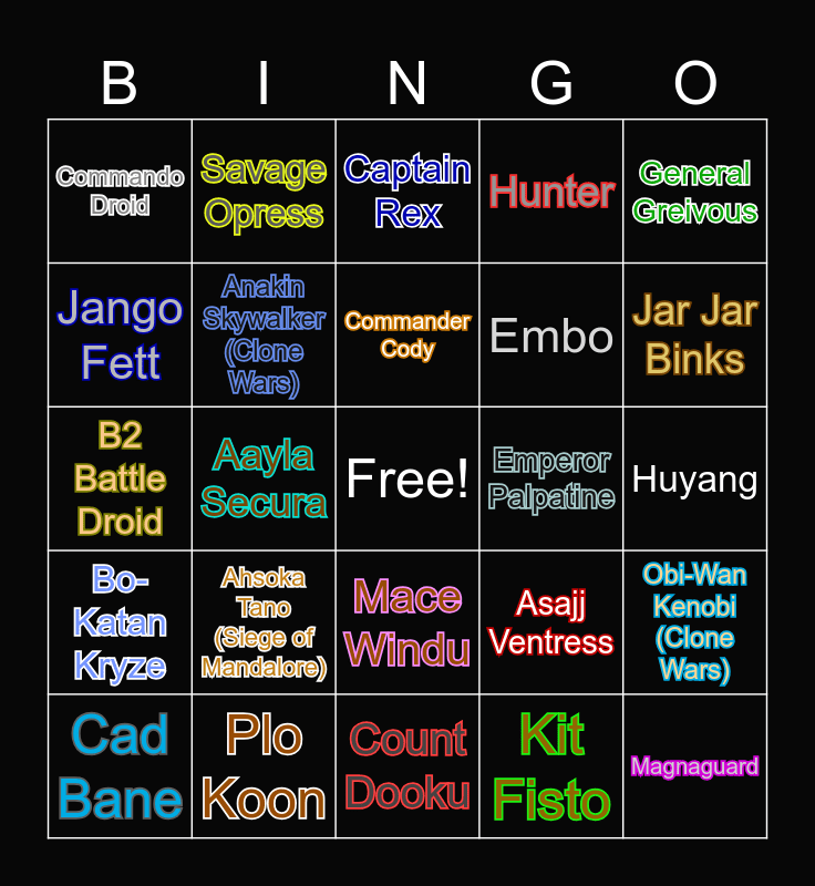 This bingo card has a free space and 24 words: Ahsoka Tano (Siege of Mandalore), Plo Koon, Commander Cody, Cad Bane, General Greivous, Commando Droid, Jango Fett, Savage Opress, Emperor Palpatine, Mace Windu, Embo, B2 Battle Droid, Asajj Ventress, Obi-Wan Kenobi (Clone Wars), Anakin Skywalker (Clone Wars), Kit Fisto, Huyang, Captain Rex, Jar Jar Binks, Aayla Secura, Magnaguard, Bo-Katan Kryze, Hunter and Count Dooku.