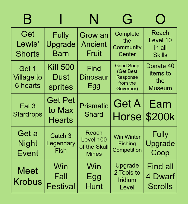 This bingo card has a free space and 24 words: Catch 3 Legendary Fish, Win Fall Festival, Find Dinosaur Egg, Meet Krobus, Reach Level 10 in all Skills, Get Lewis' Shorts, Get 1 Village to 6 hearts, Fully Upgrade Barn, Get A Horse, Reach Level 100 of the Skull Mines, Good Soup (Get Best Response from the Governor), Eat 3 Stardrops, Win Winter Fishing Competition, Fully Upgrade Coop, Kill 500 Dust sprites, Upgrade 2 Tools to Iridium Level, Earn $200k, Grow an Ancient Fruit, Donate 40 items to the Museum, Get Pet to Max Hearts, Find all 4 Dwarf Scrolls, Get a Night Event, Complete the Community Center and Win Egg Hunt.